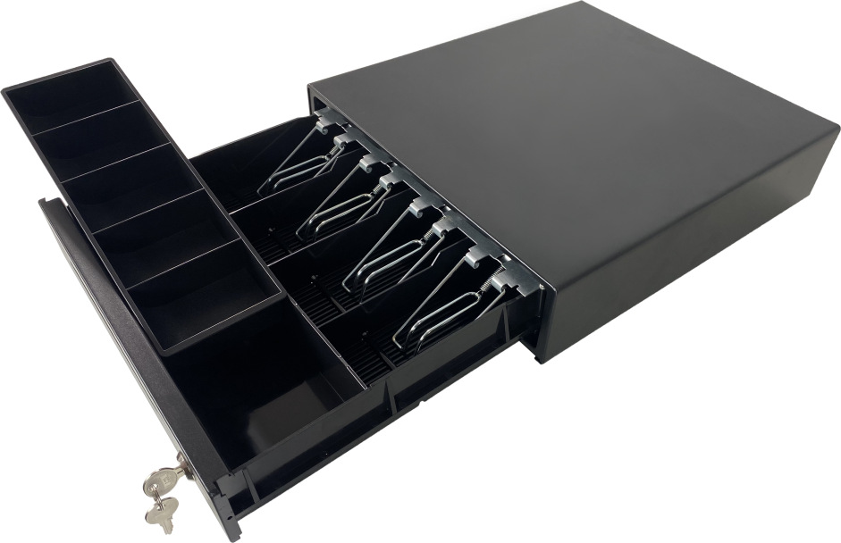 Profesionalna POS ladica za novac izrađena od čvrstog metala, idealna za sve trgovine, ugostiteljske objekte, kioske i fiskalne kase. Ladica dolazi sa snažnim mehanizmom izvlačenja i sigurnosnom bravom sa ključem.