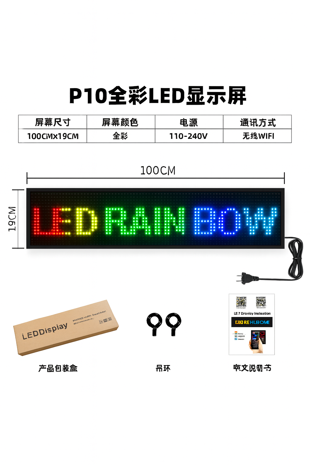 P10 RGB višebojni LED ekran dimenzija 100×19 cm pruža izuzetno atraktivan i dinamičan prikaz poruka zahvaljujući višebojnim LED diodama. RGB (full color) prikaz omogućava korištenje teksta u više boja — crvena, zelena, plava, žuta, ljubičasta i mnoge druge nijanse — čineći reklamu maksimalno uočljivom i modernom.