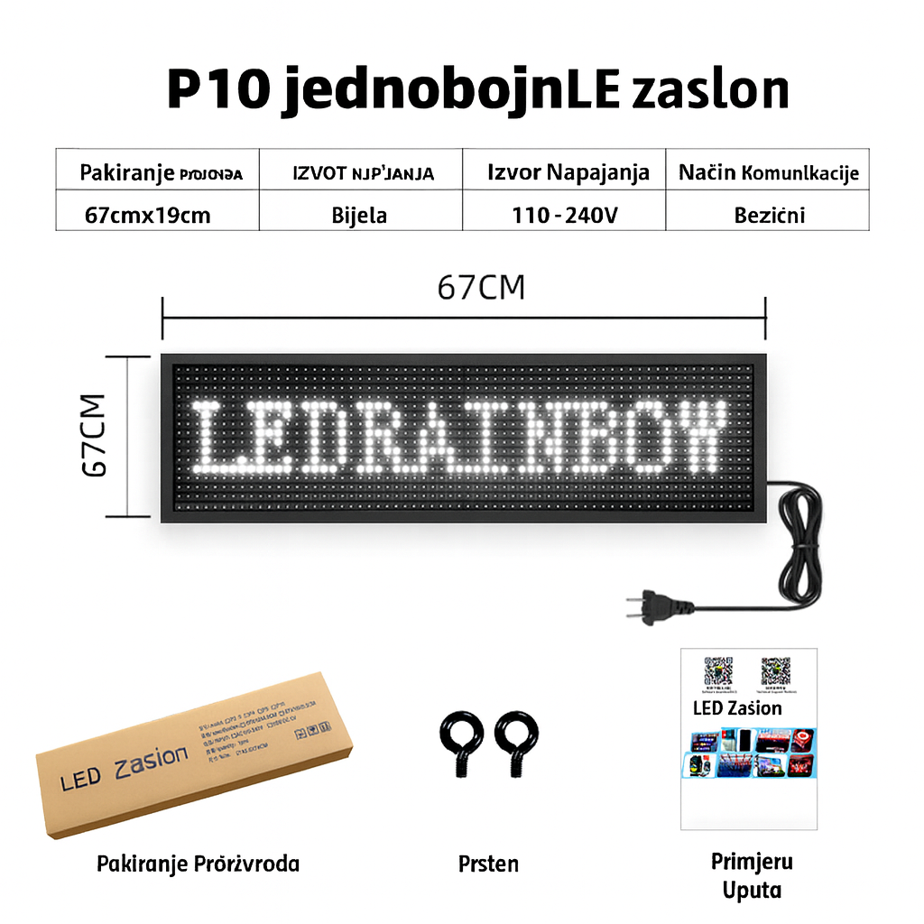 P10 jednobojni LED ekran dimenzija 67×19 cm u bijeloj boji prikaza pruža moderan i izuzetno uočljiv način za prikaz poruka, akcija, radnog vremena i drugih informacija. Bijela LED svjetlost djeluje čisto, elegantno i izuzetno je vidljiva i danju i noću, što ga čini idealnim za apoteke, beauty salone, kancelarije, kafiće, radionice i sve poslovne prostore koji žele savremen izgled.